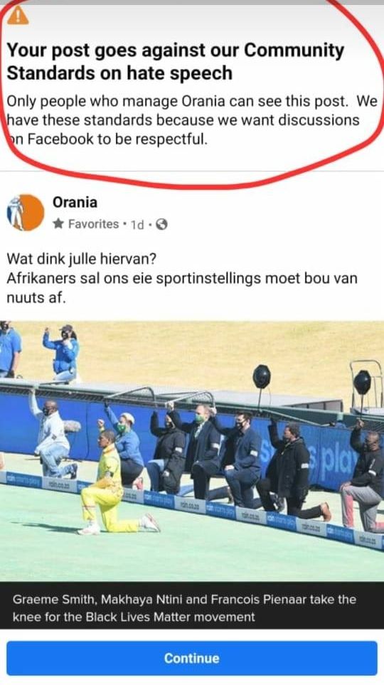 Terwyl daar die afgelope paar weke gegons word oor Facebook se besluit om die voormalige Amerikaanse president, Donald Trump se mond te snoer en sy Facebookblad ten minste tydelik op te skort, het die Orania Beweging nou ook onder dié sosiale media-platform se sensuur deurgeloop. Die Orania Beweging het ’n foto geplaas van krieketamptenare wat kniel met ’n gebalde vuis in die lug en by die plasing gevra wat ondersteuners dink van krieketspelers wat vir die Black Lives Matter-beweging kniel. Hulle het genoem dat dit tyd is vir Afrikaners om eie sportinstellings te bou. Volgens Facebook is hierdie plasing strydig met hulle beleid oor haatspraak.