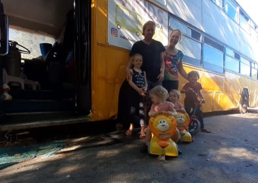 Sonja en Rheinholdt van In toer reeds die afgelope agt maande met hulle kinders van tussen twee- en sewejarige ouderdom in ’n dubbeldekkerbus wat hulle self gebou het. Die jongste twee is boonop ’n tweeling! Die egpaar, albei oud-onderwysers het voorheen in Alberton gewoon en dertien maande geneem om die bus te bou. Hulle was voorheen baie lief vir toer en het toe hulle kinders kry besluit dat hulle weer sal toer sodra die jongste kind twee jaar oud was. Toe hulle tweede kind egter twee is en die gesin na Bali toer, het Sonja swanger geraak met die tweeling. Tydens haar kraamverlof was daar twee programme op Netflix wat haar en haar gesin se lewens ingrypend sou verander. Die een is Tiny home nation waar klein spasies prakties aangewend word en Expedition happiness waarin ’n filmmaker saam met sy meisie en hulle hond in ’n bus deur Amerika toer. In die onderste deel van die bus is ’n wasmasjien met ’n sonkragstelsel, ’n volledige badkamer met ’n wasbak, toilet, kombuis en sitkamer met ’n eetkamertafel wat ook in ’n bed omskep kan word. Op die boonste vlak is ’n klaskamer, speelkamer, nog ’n toilet en die onderskeie kamers.