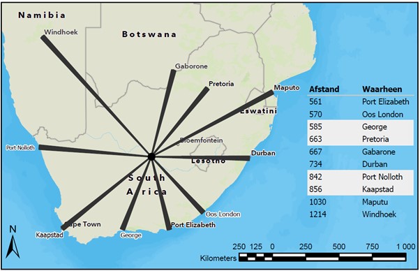 Orania is vir alle praktiese doeleindes presies in die middel van Suid-Afrika. Die kaart hieronder wys reguitlyn-afstande na hoofsentra. In volgende artikels kyk ons meer globaal waar Orania relatief tot die res van die wêreldkaart geleë is, met ’n verbeeldingsvlug vanaf Orania na die Noord- en Suid-pole, asook rondom die aardbol op dieselfde breedtegraad.
